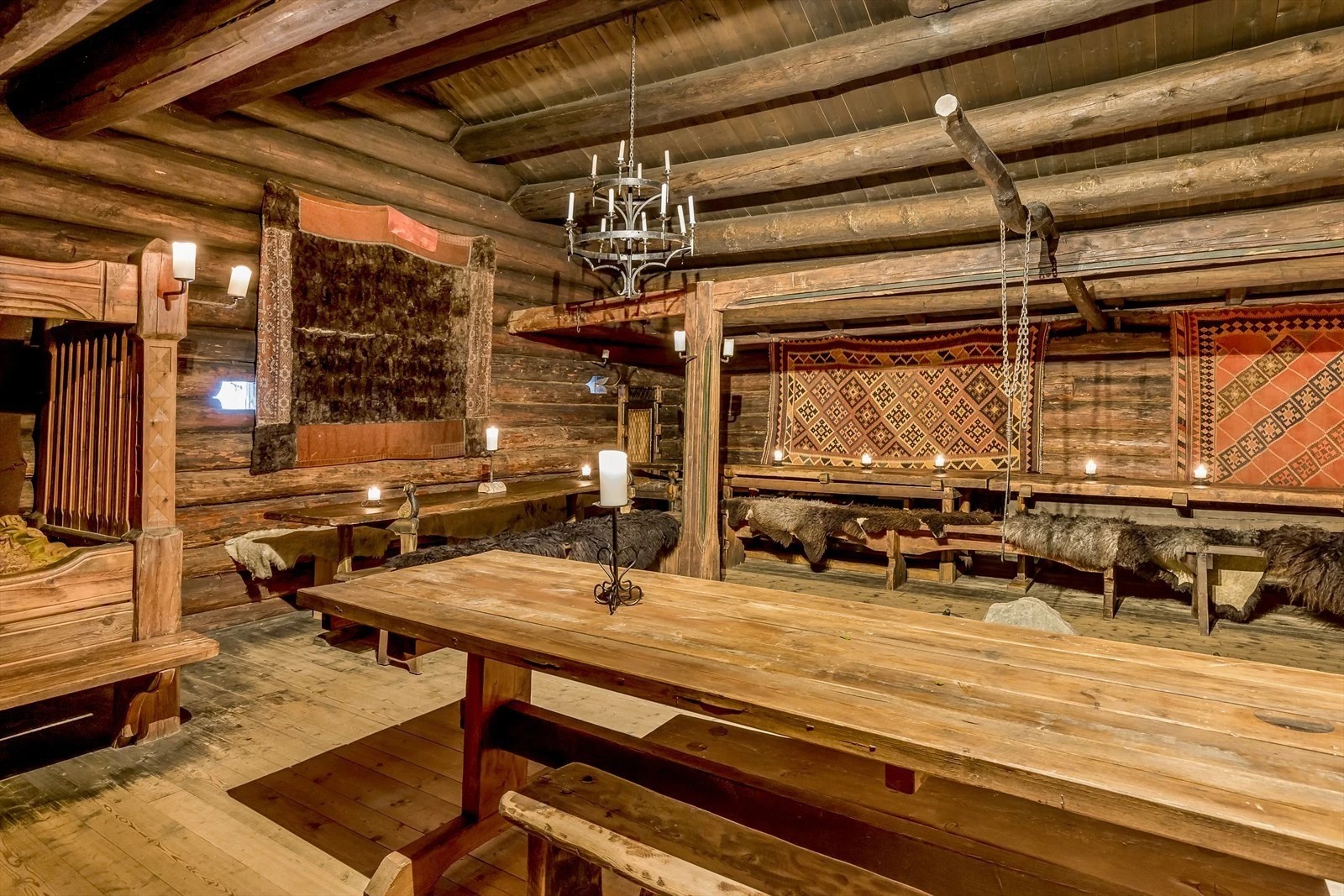 Når kvelden senker seg over gården, samles gjestene i årestua rundt langbordet. Her serveres et varmt måltid, og stemningen bygges gjennom lys, varme og fortellinger.
